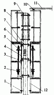 1-安全网伸缩挂钩;2-提升螺母;3-提升丝杆;4-外提升架; 5-摆线针轮减速机;6-挂钩;7-爬升靴;8-外操作架;9-模板; 10-辐射梁支承滚轴;11-辐射梁;12-内操作架