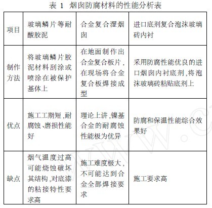 目前国内出现的几种国产烟囱防腐材料,如发泡玻璃砖内衬系统(天津电能科技有限公司产品) 、复合式泡沫玻璃砖防腐内衬(上海川达环保材料有限公司产品) 、高性能轻质玻化陶瓷(江苏艺兴紫砂陶股份有限公司产品) 、玻璃钢整体套筒湿烟囱(中冶集团建筑研究总院技术) ,填补了国内湿烟囱防腐材料的空白,但工程应用极少。电力院设计主要都是参照国外的标准和工程实践进行湿烟囱防腐设计,国内一般烟囱防腐采用玻璃鳞片等耐酸胶泥、合金复合板、进口底剂复合泡沫玻璃砖内衬等几种方案。几种防腐材料的性能分析见表一。