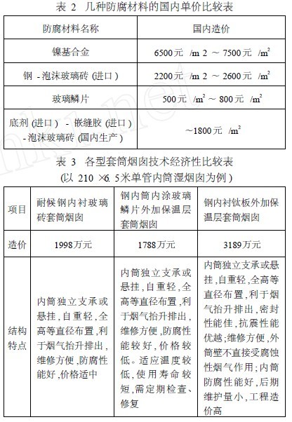 (1)套筒式钢内筒烟囱的钢内筒采用内衬钛板、钢内筒内衬玻璃砖、钢内筒内涂玻璃鳞片三种方案均能满足防腐要求。