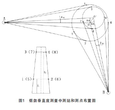 如图1所示,设O点为烟囱的设计中心点,O’点为烟囱的实际中心点。测站布置要求:A、B两测站均离O点1.5H~2.0H(H为烟囱高度)[1]保证测量的精度、二是易于观测顶部。夹角∠AOB在60°~ 120°之间。由于烟囱需要定期检测,故A、B两测点为固定测点,在厂区的平面图上有确定的位置。即LAO、LBO、∠AOB为已知量。