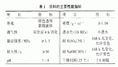 另外,涂料在聚合干燥前的分子较小,与体系中的高效渗透剂协同,可渗透进混凝土深达5mm,将砼体面层的毛细孔、微裂缝等填充密实,同时与砼面形成整体封闭保护层,隔绝有害物质侵入,而实现长久的保护作用。该涂料经检测符合国家饮用水使用标准。应用于三峡闸门导流洞、小浪底水库、裕东电厂水塔、洛阳热电水塔等,评价良好。涂料的主要性能指标参数见表1.