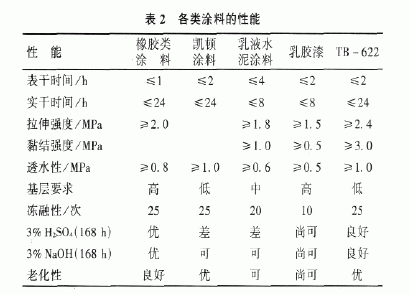 为解决旧水塔外表面的防护问题,目前常用的品种有:巴代胶、氯磺化聚乙烯涂料、凯顿涂料、乳液水泥防水涂料、外墙乳胶漆等。各类涂料的性能见表2。