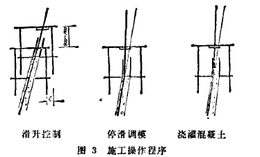 在混凝土筒体处于负倾角时(即向外放坡时)松外模,内模板以混凝土筒壁为轨道,处于滑升状态,而外模处于反锥体的外侧脱模提升。这样,使混凝土薄壁简体,在任何滑升阶段,模板组和混凝土筒壁之间的摩阻力都处于最小状态。而且模板体系的调整是在脱空的条件下进行的,因而避免了混凝土薄壁筒体拉裂和折断现象,确保了工程质量。另外,在模板结构体系设计中采取了一系列构造措施,对防止筒壁混凝土出裙子收到了良好效果。