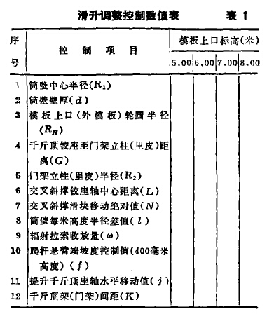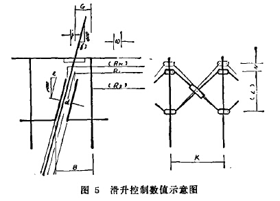 控制和调整工作是按滑升控制数值表(表1)进行的。控制项目分为二类:第一类为主要控制项目,即在每个滑升阶段都必须进行严格调整与控制的项目,如表1中的2、3、6、10、11等,第二类为检查控制项目,即在滑升中需随时检查与核对的项目,发现问题随时调整,如表1中4、7,9、11项。滑升控制数值项目知图5所示。图中特括号的数值为主要控制项目。