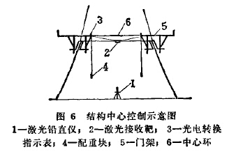 (l)结构中心线控制:应用激光铅直仪和激光接收靶控制结构中心(图6)。激光铅直仪设在塔底中心基准点上,激光接收靶悬挂在滑模结构体系中间,与模板上口同一高程,由四根绳索牵拉。当中心光斑被激光接收靶接收后,通过光电转换指示表和牵拉钢绳的调整,使光斑与激光靶中心重合,便可确认激光靶中心即为结构中心。在激光靶中心位置分别安装四根钢尺,供测量使用。