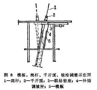 所谓直门架方案,即在双曲线冷却塔整个滑升过程中,提升门架一直处于垂直状态,而模板组在门架内作相对地变角动作,来完成双曲线回转体的成型。在达种基本状态中,筒壁倾斜角的变化,主要由调整千斤顶支承爬杆和模板组角度来实现,从初始最大正倾角逐步变化到最大负倾角。筒壁最大倾斜率可达40%左右。