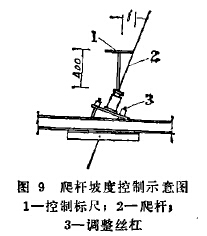 (4)千斤顶和爬杆的坡度控制。门架横梁以上部分爬杆坡度(或千斤顶)的调整是非常重要的,因为只有保证所有爬杆坡度一致,而且数值准确,滑升时各构件才能按控制数值改变各自的位置。控制方法是通过爬杆控坡小丝杠来实现的,在停滑和调模以后进行(图9)。利用专用控制角尺,按滑升控制数值表进行控制。控制后的坡度应与门架横粱以下爬杆坡度一致,亦与本层的模板坡度一致。爬杆坡度调整后方能浇灌混凝土。