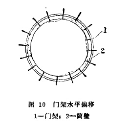 门架水平位移,即由门架组成的空间环形结构失圆,调整的方法是在模板上口刚开始滑升时,利用模板顶紧丝杠,顶紧一侧模板,同时放松另一侧模板,以已结硬的混凝土筒壁作为支承点,迫使门架向内或向外推移。调整时需注意相应的移动联结铰座,即爬杆的位置,以保证爬杆坡度不变,防止爬杼失稳变形。另外,也可采用调整爬杆坡度的办法,即调整爬杆坡度时,有意将其调整稍大或梢小些,使此门架在滑升时较其它门架相对向内或向外移动,从而达到纠正门架位置的目的。