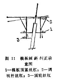 门架倾斜将造成内、外操作平台不平。调整的方法同样通过模板顶紧丝杠调整,改变伸缩夹板的长度,使门架恢复直立(图11)。