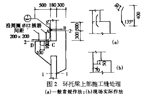 下环梁嵌入凹槽内可以改善它在环托梁上的抗滑性能,在浇筑环托梁混凝土时留设插筋,使下环梁与环托梁能成为一个整体,也用插筋承担滑移产生的部分勇力。