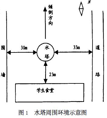 路33 m , 西面距离围墙30 m , 南面距离学生饭堂23 m , 北面为一空旷的场地, 水塔距离北面的学生宿舍200 m 左右, 周围没有重要的建筑物和地下管线, 爆破环境不复杂, 北面可作