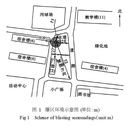 某单位因改为无塔供水,其院内原供水的水塔废弃,其场地已规划修建1栋宿舍楼,需将其进行拆除。水塔东侧28 m处是校园道路, 55 m处是宿舍楼;东南侧为拆除房屋后的空旷场地,南侧15 m处是道挡土墙,高差2 m, 27 m处是2层门面,西侧2 m处是道路, 9. 6 m处是宿舍楼;北侧15 m处是围栏和道路;另水塔四周有花草、树木、假山、雕塑等,周围无地下管道和地面架空电缆。见图1环境示意图。
