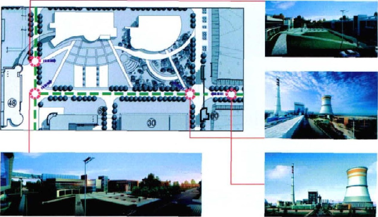 电厂的建筑空间环境包括宏观和微观两个方面特征,从不同距离看电厂建筑,有着不同的形象特征。远看电厂时,烟囱、锅炉、主厂房等标志性建构筑物高大的天际轮廓线展示电厂建筑外在的宏观形象特征,它们是体现厂区外部空间环境的主体;走近电厂时,感受到更多的则是由标志性建筑和其它附属建筑及场地道路、室外设备管线共同组合的微观形象特征,体现厂区内部空间环境;这两种特征共同构成电厂的整体形象。为了满足工业旅游项目的需求,我们设计了完整的空间景观轴网,重点对电厂标志性建筑和厂前建筑区进行了规划设计,以营造一个和谐的厂区空间。
