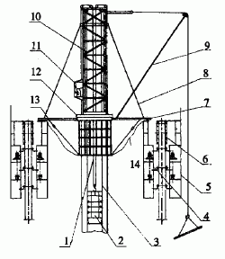 1-吊笼钢丝绳;2-吊笼;3-导索;4-内操作架;5-外操作架;6-模板;7-辐射梁; 8-斜支撑; 9-扒杆; 10-井架;11-电气控制室;12-鼓圈;13-悬索拉杆;14-安全网
