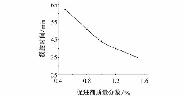 凝胶时间与缠绕工艺、纤维浸润、产品质量关系密切, 本工作对凝胶时间和各种助剂的配比进行了优化和筛选, 按照GB/T 7193-2008《不饱和聚酯树脂25℃凝胶时间测定方法》测试了凝胶时间, 重点研究了室温下固化剂含量为1.5% (质量分数, 下同) 时, 促进剂含量与凝胶时间的关系。