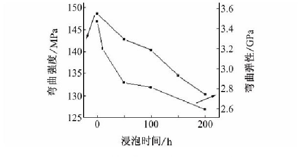 由图5可见, 随着浸泡时间的延长, 弯曲强度和弯曲弹性均下降。结构浸泡200h后的弯曲强度和弯曲弹性分别为浸泡前的87.64%和82.08%, 均大于80%, 可以认为结构具有优良的耐蚀性[9]。