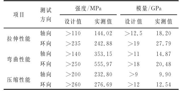 典型铺层结构的元件级试验数据对最终产品铺层结构设计起着重要作用。通过典型方向受力形式的试验进行验证, 结果表明:其轴向和环向的拉伸强度分别为352 MPa和21 MPa;其轴向和环向的拉伸模量分别为35.28GPa和1.90GPa;其拉剪强度为13.86MPa。这表明铺层结构的力学性能满足国内外现行标准要求[3-10]。