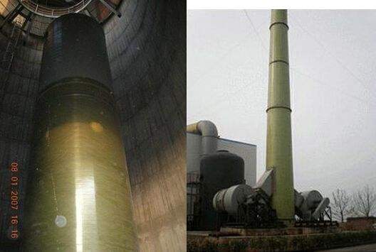 整体玻璃钢烟囱采用玻璃纤维增强塑料 (FRP) 具有轻质、高强、耐化学腐蚀、绝缘隔热, 耐瞬时高温烧蚀、强度和形状可设计性强的特点。成型后的玻璃钢结构层抗拉强度与普通钢材相当。但是玻璃钢长期耐高温性能差, 弹性模量低, 易老化, 在紫外线、风、沙、雷、雨、化学介质、机械应力等作用下容易导致性能下降;施工时容易发生火灾, 成本较高。