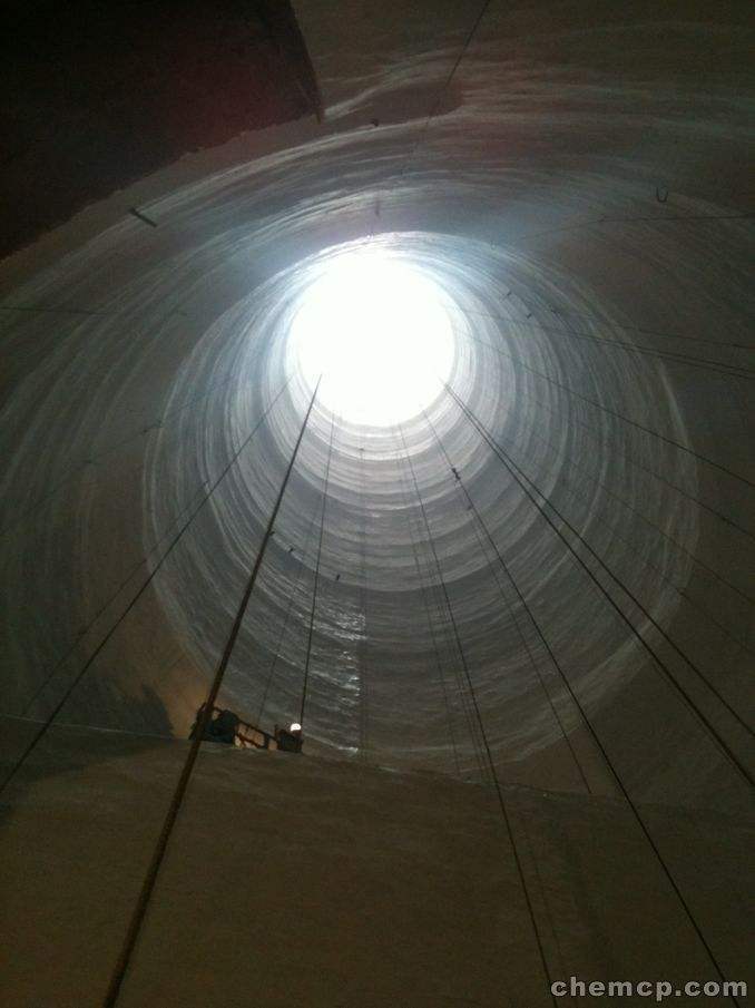 烟囱结构形式为正六边形单筒式钢筋混凝土结构,烟囱主体结构高100m,烟囱出口边长为3m的正六边形。采用石灰石-石膏湿法脱硫工艺,机组脱硫设施正常运行时,计算烟气温度为50℃左右;事故工况时,烟气温度可达140℃。烟气腐蚀等级为强腐蚀性,烟气腐蚀的类型包括硫酸、氯酸、盐酸、硝酸、氯化氢等。烟囱防腐施工范围:从净烟气混凝土烟道进口至烟囱至烟囱出口所需的防腐,底部积灰平台防腐,隔烟墙防腐,顶口防腐。烟囱防腐面积为1575㎡,烟道防腐面积为736㎡。