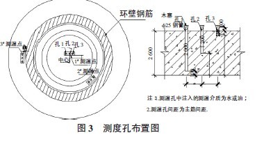 (1) 测点布置.该工程共设3 个测点,每个测点设上、中、下三个测温孔,详见图3.在混凝土浇筑前,将直径为准20PVC 管或钢管预先放置在底板内并高出板顶100 mm,管长度分别为2 000,1200,250 mm,并固定在底板主筋上,每个测温点的三个测温孔的间距以底板主筋间距为准,钢管下口先封闭死,温度计顶端与预埋管之间用保