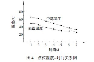按照以上措施进行施工,并在混凝土浇筑成型初凝后覆盖一层塑料薄膜和两层草袋子进行保温养护,能满足有关大体积混凝土温控要求.