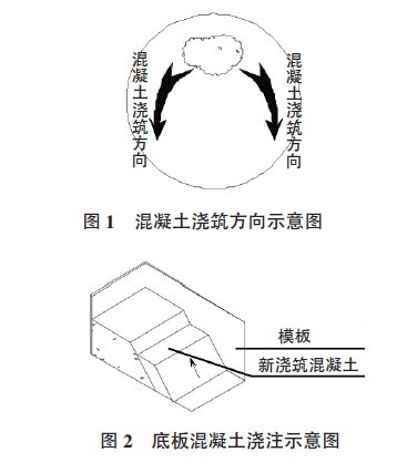 车配合溜槽入模的方式继续浇筑,只允许在环壁与基础底板交接面留水平施工缝,其他部位不允许出现施工缝.