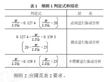 该准则由Zorrilla 加以补充和完善,包含2 个细则。细则1 判定是否需要进行振动分析;细则2 判定结构在诱导振动时是否稳定。其判定时所依据的主要参数是重量载荷,因此,可将该准则称为载荷判据。细则1 :应满足表1 要求。