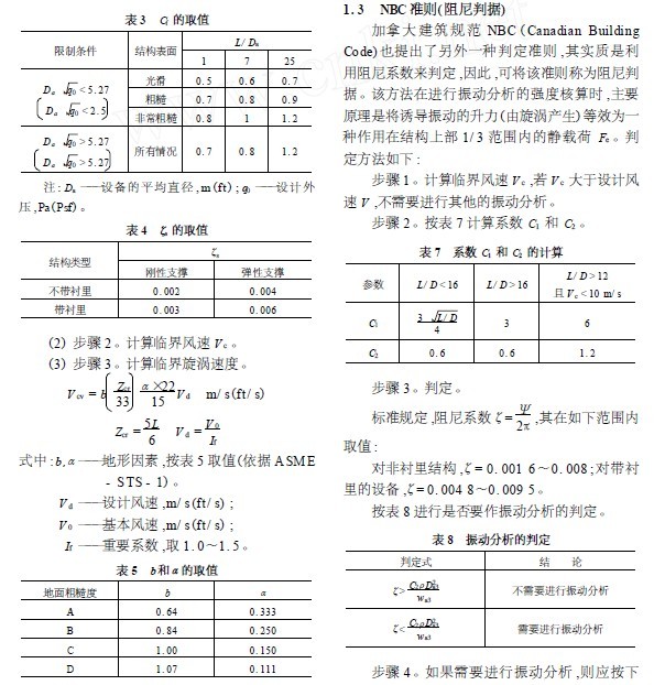 定条件。国内外很多学者在这方面进行了深入细致的研究,得到了一些很有价值的的准则。本文先以这些准则的基本原理为基础,对诱导共振的判定条件作一归纳分析,并简要阐述振动分析的思路和方法; 对国内的设计标准JB 4710 —2005附录A ,本文针对基本风压的计算式等两个问题,提出质疑。