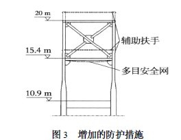 这样, 当工人在各层平面的最外缘梁身上移动行走时, 可以倚扶着角钢, 不至于当出现大风、眩晕、物体击打等突发情况时, 身体完全无处倚靠借力平衡而失足坠落。当工人在各个平面的内部水平梁上移动行走时, 若失足则掉在柔软的安全网上, 不会造成伤害, 可以继续复位工作。当某一平面的安装作业完成后即拆除以上保护装置(角钢和安全网) , 移装至上一层待作业的平面。
