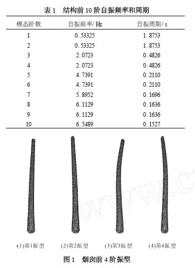为了确定烟囱的自振特性,采用子空间迭代法进行计算,通过模态分析提取结构前10 阶频率,从而求得烟囱自振周期,如表1 所示。由于烟囱属于平面轴对称结构,故其水平X 、Y 方向的自振周期基本都是成对出现。由上表可知:烟囱的第1 阶自振频率为0. 53325 Hz ,第1 自振周期为1. 8753 s。计算得到前4 阶振型,如图1 所示。利用有限元分析软件进行烟囱地震反应分析