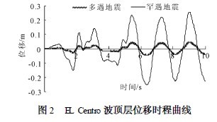 利用分析程序,用完全法进行结构瞬态动力学分析。图2 和图3 是输入一维地震时烟囱顶部的位移时程曲线。从图中曲线可知:烟囱在不同地震波作用下的位移反应有明显差别,烟囱顶部位移反应峰值并不在同一时刻发生。罕遇地震作用相对于多遇地震作用下的烟囱顶部位移时程反应有成倍增加。