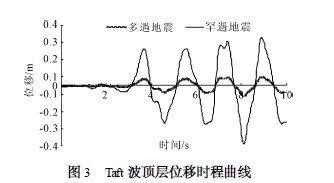 为比较分析,选取2 条Ⅱ类场地土的天然地震记录进行分析计算:EL Centro 南北方向波,记录时间为30 s ,加速度峰值为341. 7 cm/ s2 ,记录时间间隔为0. 02 s ;Taft 波东南向地震记录持时为54. 38 s ,加速度峰值175. 945 cm/ s2 ,记录时间间隔为0. 02 s。工程中确定持续时间的原则是:地震记录最强烈部分应包含在所选持续时间内。对结构进行弹塑性最大地震反应分析,一般可考虑取持续时间为结构基本周期的5~10 倍。