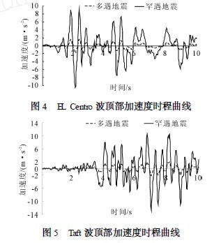 在输入EL Centro 波、Taft 波两种地震波作用下,烟囱顶部的加速度反应曲线见图4 和图5 所示。在罕遇地震作用下,烟囱顶部加速度相对于输入的地震波加速度有明显动力放大效应。由此可见,烟囱地震反应与结构本身的动力特性、地震波的频谱特性和地震强度都有关系,结构在不同地震波的激励下的地震反应表现出明显的差异。