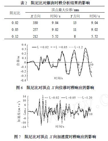 《烟囱设计规范》( GB50051 - 2002) 规定,钢筋混凝土烟囱,其阻尼比取0. 05 ;该规定是烟囱结构基本处于弹性阶段时的阻尼情况,当烟囱结构接近或进入弹塑性阶段后,目前普遍认为其阻尼与材料的应力或变形状态相关,是随应力或变形的发展而增加的。以输入EL Centro 地震波为例,分别取3 种不同阻尼比0. 02、0. 05 和0. 12 时,比较不同阻尼比对结构地震响应的影响。图6 和图7 是烟囱在7 度X 向罕遇地震作用下顶部位移和加速度时程曲线。烟囱阻尼比对烟囱顶部位移时程曲线的影响较大,伴随阻尼比的增大,烟囱顶部位移峰值及加速度峰值均在减小。从表2 可以看出,阻尼比不同,结构的变形到达峰值的时刻也有所不同,随着阻尼比的增大,烟囱顶点位移达到峰值的时间有提前的趋势。分析结果证明了阻尼比对结构地震反应的影响较大,不容忽视。