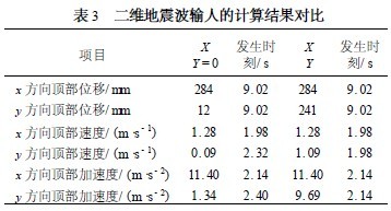 输入EL Centro 地震波进行计算,其顶层最大反应结果见表3 所示。从表3 可以看出,在双向地震波同时输入时得到的X 方向的位移分量、速度分量和加速度分量相比单向输入时基本没有变化,而Y 方向的位移分量、速度分量和加速度分量则增加比较显著。