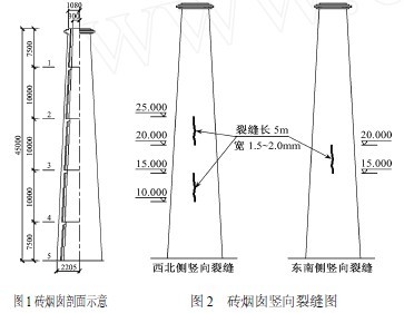 右,宽度115~210mm,其余部位发现有细如发丝的竖向裂隙,但无环向裂缝。从裂缝的部位、走向及长度、宽度进行分析认为,该烟囱的竖向裂缝对烟囱的安全使用造成威胁,其余细微裂缝尚属正常。