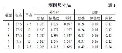 从工程图纸来看,烟囱高45m,共划分为5 节,由底至顶每节的高度分别为715 ,1010 ,1010 ,1010 ,715m(图1) ,上口内径为114m,筒壁坡度为215 % ,烟气温度为250 ℃。筒壁采用MU10 红砖,M5 水泥石灰混合砂浆,内衬采用MU715 红砖,设50mm 空气隔热层。烟囱的具体尺寸见表1 。