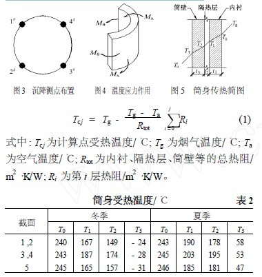 尽管烟囱筒壁的厚度比较薄,但高温还是会导致筒壁内外表面产生温差,温差对结构产生的应力、应变比较大,常常成为造成结构问题的主导因素,不可忽略。温度应力作用如图4 所示。