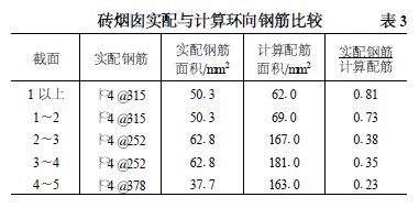 然后按下式计算每m高筒壁所需配置的环向钢筋面积,计算结果及烟囱实际配筋如表3 所示。
