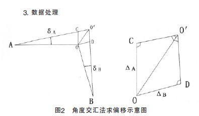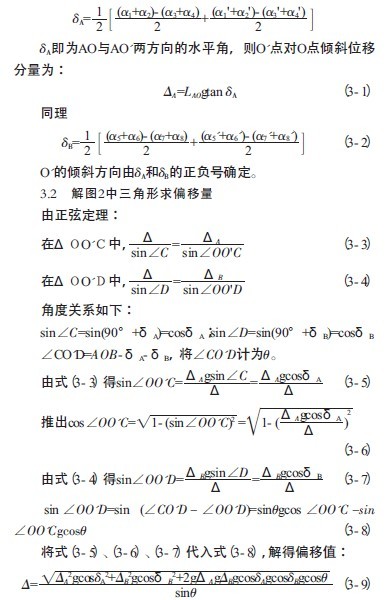 由于A、O、B都有确定的位置,方向已知,故只需算出OO'与OC或OD的夹角即可。这里以求OO'与OC夹角为例。先由式3- 3算出,再由三角形内角和定理求出。于是OO'相对于AO的偏角就求出来了,自然偏移方向也就知道了。