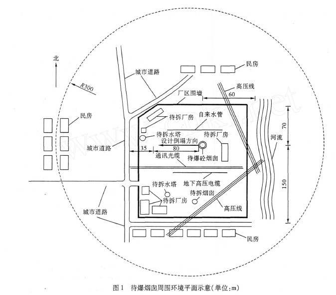 钦州电厂厂区建、构筑物需要全部拆除,其中钢筋混凝土烟囱需要用爆破方法拆除。该烟囱位于厂区中间,周围地势平坦。东面有待拆厂房和在用高压线,距离43 m;南面有在用高压线、架空通讯光缆和地下高压电缆等设施,距离50 m;北面距离待爆烟囱30 m处地下有自来水管;西面85 m范围内厂房已拆完,地下无管线设施,距离待爆烟囱95 m处为待拆的小水塔和厂区围墙,围墙外除道路外无其它设施。工程环境示意图如图1示。