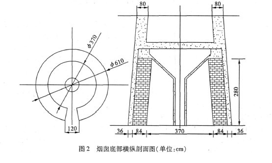 该烟囱高80 m,底部外径为6. 1 m,筒壁材质为钢筋混凝土和红砖的混合结构,配有2层钢筋,外层主筋直径为20 mm,内层主筋直径为12 mm,双箍筋,箍筋直径为8 mm,主筋间距为15 cm,上、下箍筋间距为20 cm。砼标号为600# ,比较坚固。混凝土壁厚为36 cm。底部红砖层厚为84 cm。烟囱底部东面有1个出灰口宽1. 2 m;距离地面3. 5 m处南面、西面各有1个进灰口。烟囱底部断面结构示意图如图2所示。爆破要求不能破坏周边的水管、电缆等设施。
