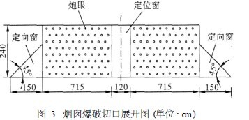 在烟囱底部0. 5 m高处布置爆破缺口,在设计倒塌中心线处开定位窗,在爆破缺口两侧开定向窗,爆破缺口形状为类梯形[ 2 ] ,定位窗为矩形,定向窗为三角形。80 m砖_钢筋混凝土复合结构烟囱爆破拆除