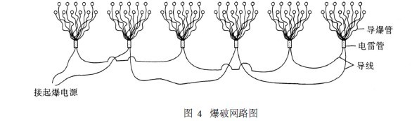 爆破网路采用电和非电复式起爆网路,即用瞬发电雷管激发非电导爆管雷管齐发起爆,起爆网路如图4所示。