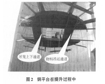 1)钢索式液压提升装置的操作人员乘坐吊笼至烟囱筒首,操作液压装置缓慢提升安装作业平台至顶层平台安装作业面(图2)。