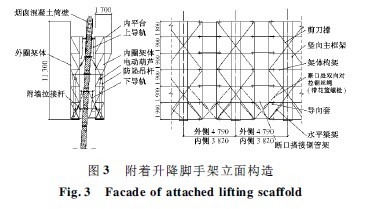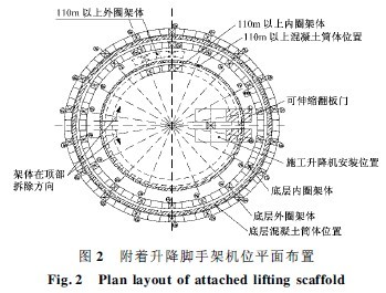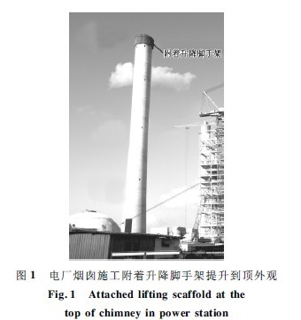 央,结构庞大,制作成本和安装拆卸费用高,而且钢结构施工平台不能重复使用,烟囱施工的效率及安全性均较低。靖海电厂烟囱施工中由于采用了附着升降脚手架,内、外圈架体呈全封闭圆环形双排防护,人员施工及上下均安全可靠;圆环形架体有利于施工升降机靠近筒壁附着和安装,且将升降机吊笼门改制成可伸缩的翻板门,也解决了施工升降机与附着升降脚手架顶部平台之间的通行问题,使施工人员和材料方便地进出到架体上( 见图2 )。安装施工升降机后,缩短了每次人员及材料上下的时间,提高了劳动效率,特别是采用了具有国家标准的定型产品。附着升降脚手架和施工升降机配合施工,使烟囱施工的整体安全性有了可靠保障。