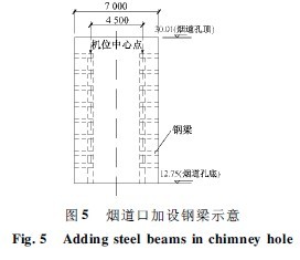 根据设计图纸,当架体提升至12. 75 ~ 30. 01m 高度时,有4 组(8 个机位) 处于烟道口位置。为确保架体安全、顺利通过烟道,在烟道口设置了4 道钢横梁,钢横梁一端与烟道口墙体的预埋件焊接,另一端加焊钢立柱,在机位处钢横梁的上部分别焊接预埋管,以便安装拉杆、提升钢梁及防倾覆装置( 见图5 )。这样可确保4 组机位附着点有牢靠的位置安装,使架体顺利地提升通过烟道口。