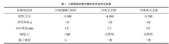 目前在国内外电厂烟气脱硫装置中烟囱内壁防腐施工鳞片复合材料已广泛应用,如在设计浙江乌沙山发电厂4×600MW燃煤机组烟气脱硫烟囱内壁防腐工程中, 因为某些客观因素,此脱硫系统未设置烟气再热装置(GGH),进吸收塔管道原烟气的温度为110℃,最高可达130℃,而经吸收塔后出来的净烟气温度为60℃左右, 对吸收塔后烟道和烟囱有很强的腐蚀性,在此工况下除采用适量的合金板外,对于高温区烟道和低温区烟道采用了不同的乙烯基脂树脂高性能防腐蚀鳞片复合材料内衬,从而延长其使用寿命。由于该工程在FGD 装置中省却了GGH 装置, 从而节省装置的设备费用达3 600 万元,其他安装等费用达600 万元,这样FGD建设费用可节省4 200 万元。以发电厂2×600MW燃煤机组一座内筒直径6m,高240m的烟囱为例,就其不同的防腐设计做个技术经济比较见表1。