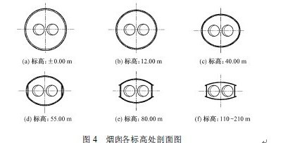 烟囱外形由底至顶呈流线型变化, 参照设计部门提供的初步设计图纸, 共给出了6 个不同标高处的剖面图, 如图4 所示。