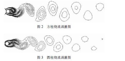 图2, 3 分别为方柱、圆柱绕流非定常风场稳定后某个相位上的涡量图, 可以看出, 在方柱或圆柱下游风场呈现出卡门涡街流动状态, 涡之间以交错排列形式进行。由此得到: 完全发展方柱绕流的CL, rms= 01579,St= 01135, 同文[ 8] 给出的相近雷诺数方柱绕流结果( CL, rms= 01552, St= 01141) 比较一致; 完全发展圆柱绕